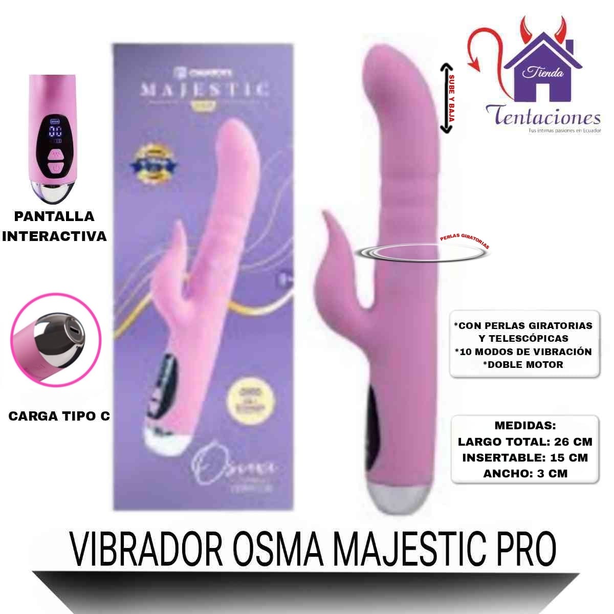 - Experimenta una nueva dimensión de placer con el Vibrador Osma Majestic Pro , diseñado en un sofisticado color rosado y pensado para ofrecer una estimulación intensa y completa. Este vibrador combina una función de penetración con vibración focalizada en el clítoris, además de perlas internas que generan un movimiento giratorio estimulante, brindándote una experiencia profundamente placentera